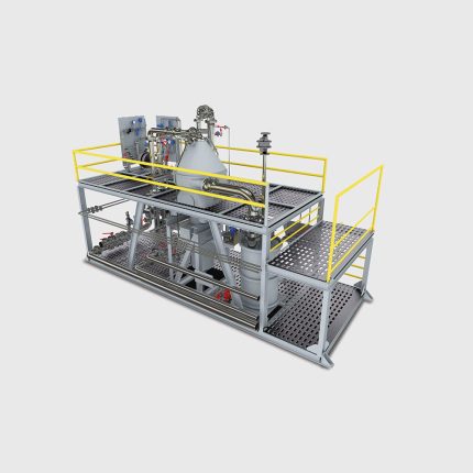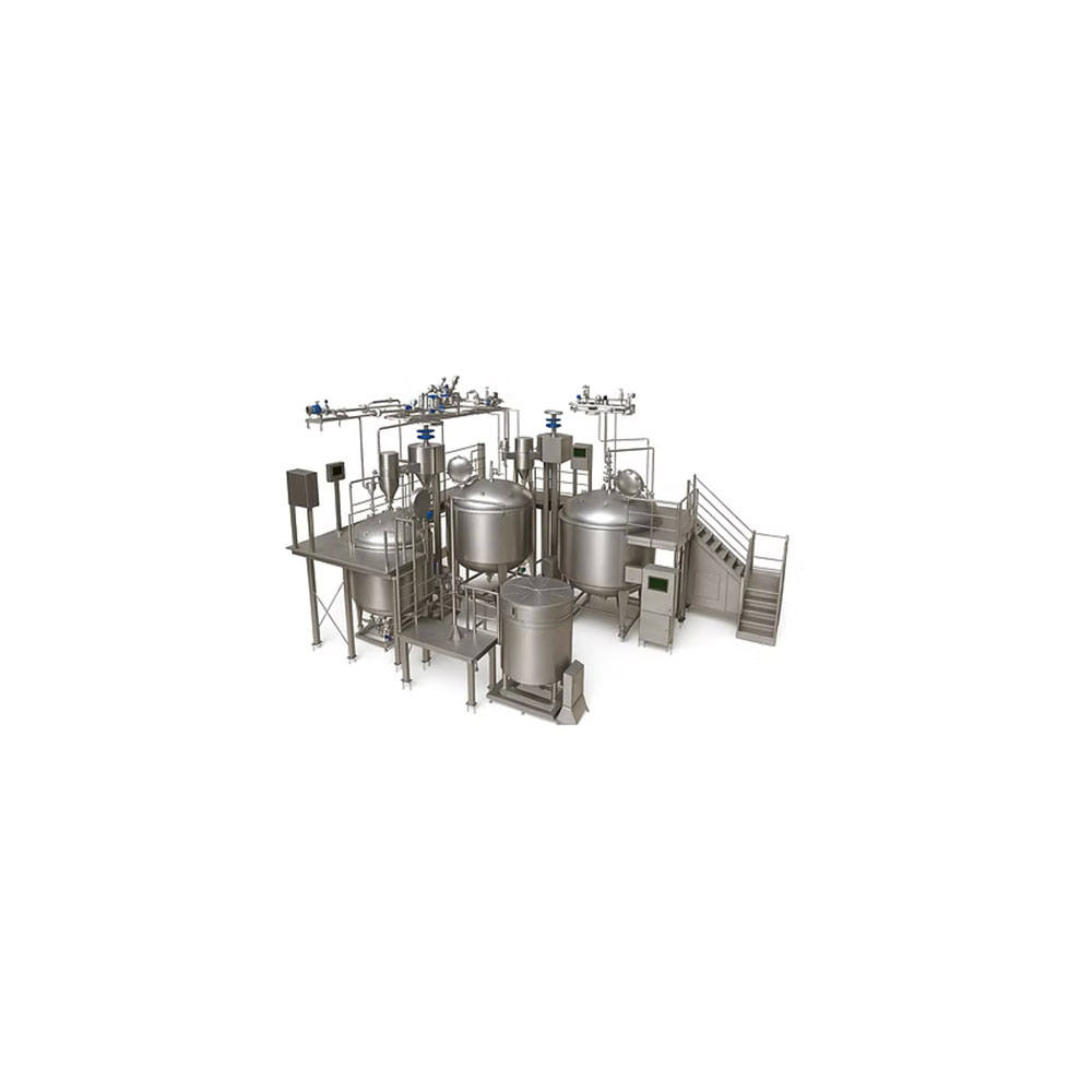 The mixing area comprises one or more mixing tanks used for dissolving, dispersing, or mixing active ingredients or excipients. These tanks are designed for hygienic process conditions in accordance with pharmaceutical requirements – e.g., high surface quality up to e-polishing surface finishes, and comprehensive liquid media introduction via pipelines using spray balls. Subsequently, liquid and/or solid additives are conveyed to the main processing area via an integrated lifting system (lifting column). The lifting system, equipped with chemical- and pressure-resistant pumps and collection tanks, ensures pumping capability even without a gradient.