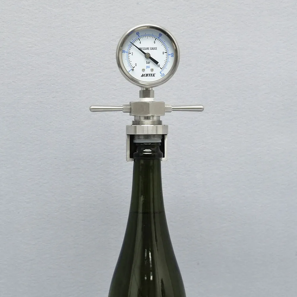 A durable, stainless steel device designed to monitor and measure pressure during secondary fermentation in bottled beverages, ensuring accurate and consistent readings for optimal carbonation and product quality.