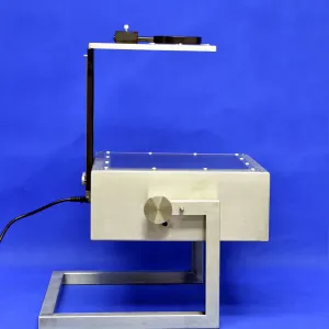 A glass stress viewer designed for qualitative inspection of glass components, featuring adjustable focus, table inclination, and a removable magnifier for precise analysis of residual stresses.